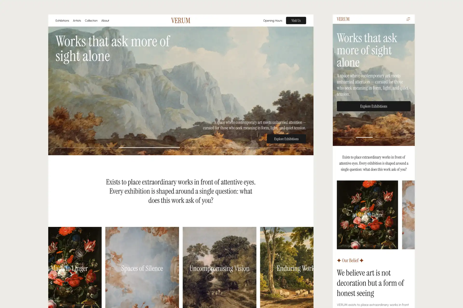 The Verum landing page demonstrates how digital design can honor the traditions of physical gallery curation while leveraging web-specific advantages like dynamic layouts and infinite scroll. Rather than competing with the artwork through busy interfaces or unnecessary decoration, the design serves as a pristine backdrop that elevates each piece. By embracing minimalism, intentional spacing, and restrained typography, Verum differentiates itself in the art world—offering not just a website, but a carefully curated digital exhibition space that respects the integrity of the art and the sophistication of its audience.