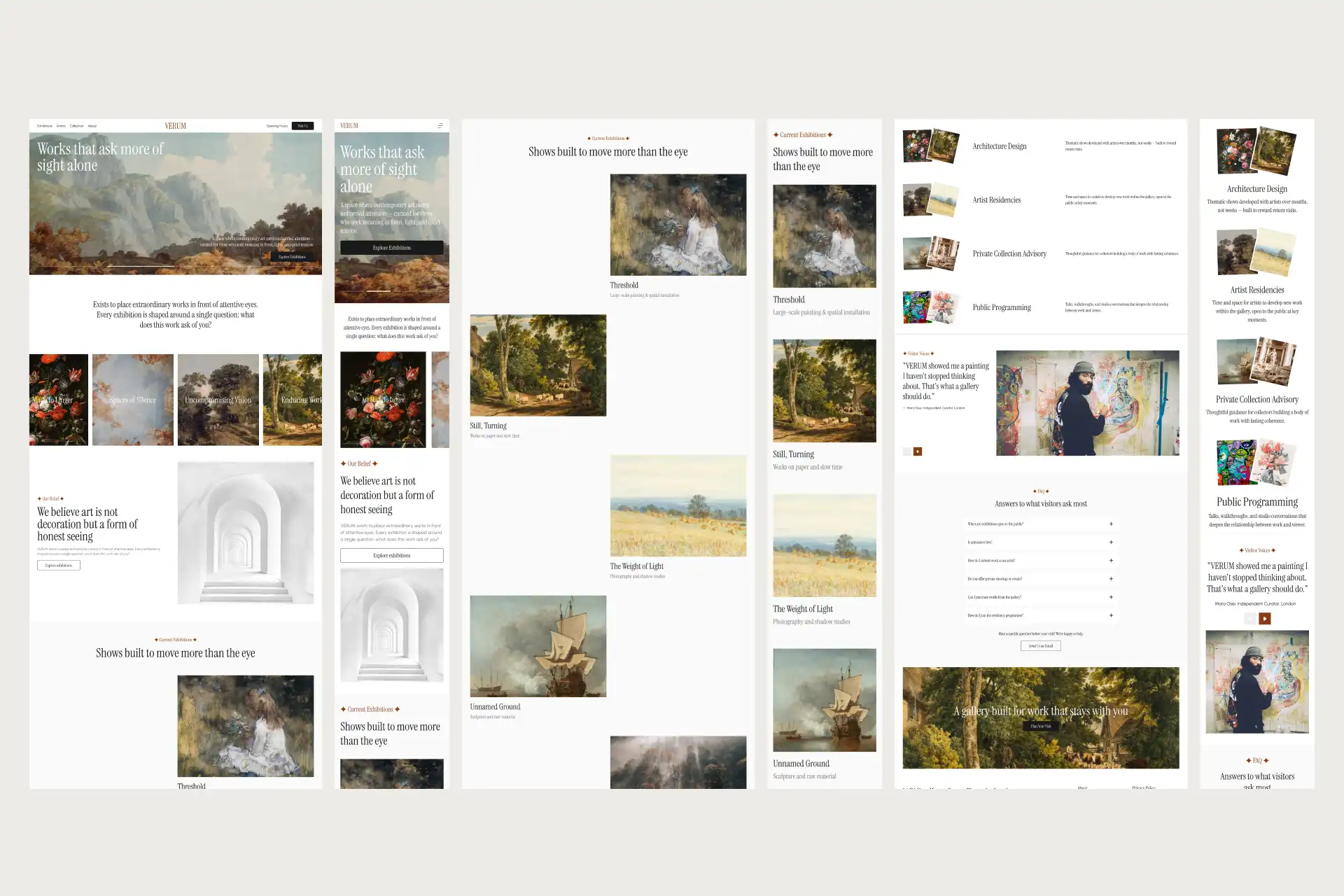 The final design successfully translates the gallery experience into digital form through meticulous attention to negative space and typographic restraint. Full-bleed artwork images command attention while subtle animations and hover states add interactivity without distraction. The monochromatic framework ensures that colorful artworks become the focal points, creating natural visual hierarchy that guides the eye. Strategic placement of inquiry CTAs and exhibition details provides clear pathways for engagement, while the overall aesthetic positions Verum as a prestigious, museum-quality venue that respects both the art and the viewer's experience.